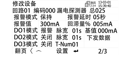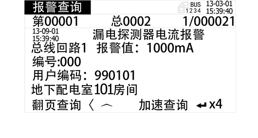 可在設(shè)備信息菜單中查詢探測器信息:各回路漏電探測器和溫度探測器在線數(shù)和總數(shù)。