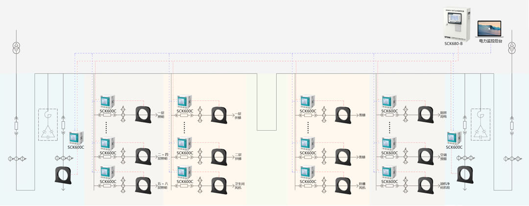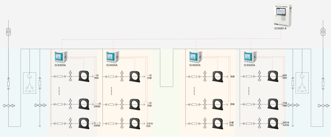 在饋線柜每個回路安裝一個SCK600Y剩余電流式電氣火災(zāi)監(jiān)控探測器、SCK600YT測溫式電氣火災(zāi)監(jiān)控探測器和NTC溫度傳感器,一排或多個配電柜配置一臺SCK630監(jiān)控單元。