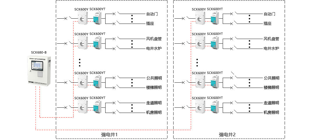 在每個配電箱內(nèi)安裝一個SCK600Y剩余電流式電氣火災(zāi)監(jiān)控探測器、SCK600YT測溫式電氣火災(zāi)監(jiān)控探測器和NTC溫度傳感器,SCK600Y剩余電流式電氣火災(zāi)監(jiān)控探測器、SCK600YT測溫式電氣火災(zāi)監(jiān)控探測器通訊線直接連至電氣火災(zāi)監(jiān)控設(shè)備。