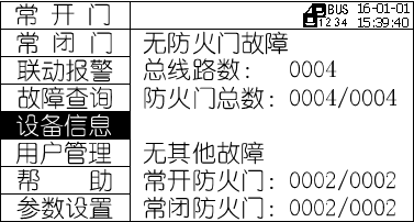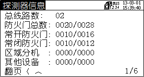 可在設(shè)備信息菜單中查詢防火門監(jiān)控模塊設(shè)備信息:監(jiān)控器所接各類監(jiān)控設(shè)備的在線數(shù)和總數(shù)。