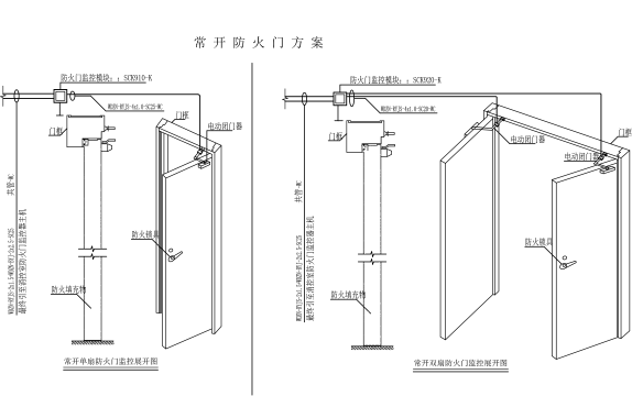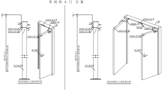 常開門采用分體式監(jiān)控模塊和電動(dòng)閉門器方案,即雙扇常開防火門在左右兩扇門門框處各安裝一臺(tái)BS860電動(dòng)閉門器,在門旁墻體上安裝一個(gè)SCK920-K防火門監(jiān)控模塊;單扇常開防火門在門框處安裝一臺(tái)BS860電動(dòng)閉門器,在門旁墻體上安裝一個(gè)SCK910-K防火門監(jiān)控模塊。