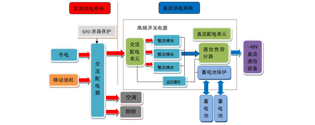 基站供電系統主要由交流供電系統和直流供電系統組成。交流供電系統:由一路市電電源、一路移動油機電源、浪涌保護器、交流配電箱(具備市電油機轉換功能)組成。直流供電系統:由高頻開關組合電源(含交流配電單元、監控模塊、整流模塊、直流配電單元)、兩組(或一組)蓄電池組成。