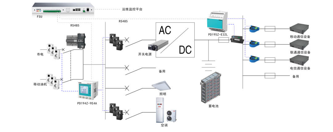 基站內的開關電源、空調、照明以及插座都由交流配電箱進行供電,并通過多回路交流表計實現高精度分路測量,而基站內各類通信設備主要是由直流系統進行供電,利用直流電量分路計量設備對不同運營商的通信設備實現能耗監測,最終都通過FSU設備接至運維監控平臺,實現對通信基站能耗的有效監測及運營管理。